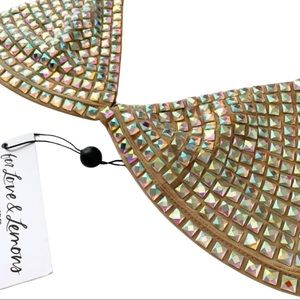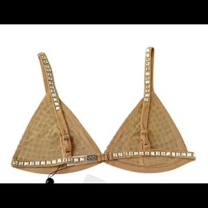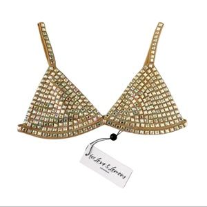 For Love and Lemons Victoria’s Secret exclusive Beige Jackpot bralette. Iridescent sparkly stones cover a nude mesh bralette. Unlined. Adjustable straps. Back S-hook closure.