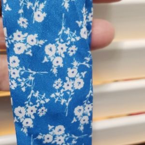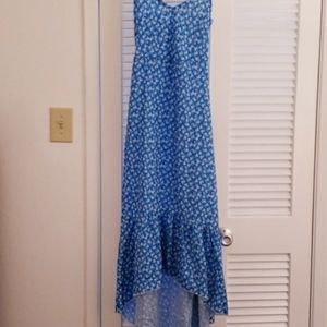 Blue and White Maxi Dress, high low hem with Ruffle and separate tie for waist. Pullover with elastic in back and thin Spaghetti Straps. Material is very smooth & comfortable.