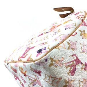 💕White and multicolor monogram watercolor coated canvas with brass hardware, dual rolled top handles, tan vachetta leather trim, creme canvas lining, single slit pocket at interior wall and zip closure at top.