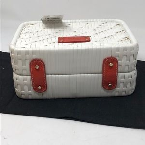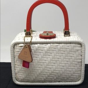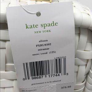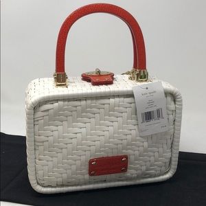 New with tags Kate Spade Alison White Handbag. Approximately 8.75”L x6.5”T x4”D. It has orange wood handles, toggle closure, a bag charm. The interior has a zippered pocket and a miscellaneous pocket. It looks like a straw bag but is another material. Comes with a dust bag. Please see my other listings and bundle to save.