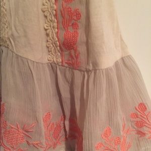 Boutique bought top. Light and gauzy but not see through. Wonderful embroidery work in peach and other woven detail in cream. Adorable! Size S by Paper Crane. Double button banded neck with open slit back. Very Boho!