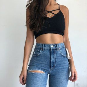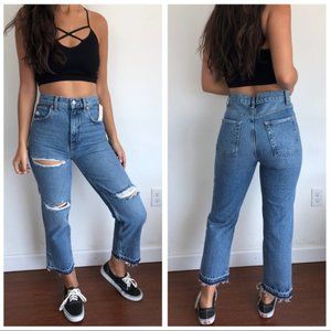 Features heavy distressing. Fading and whiskering and has a zip and button closure. Cropped leg. Frayed raw hem.