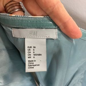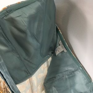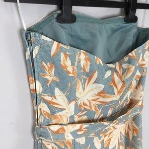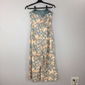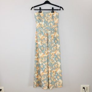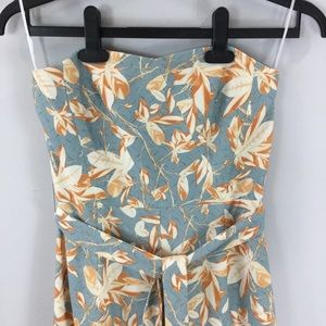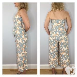 H&M wide leg cropped strapless floral leaf lattice pattern jumpsuit. Size 6. Like new condition. Top is lined, bottom is not. Side zip, waist tie belt, sticky strip around top. No boning. Peach, light orange, blue, cream leaf pattern. Shown with green straw bag also for sale bundle and save