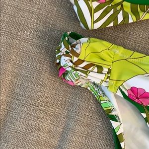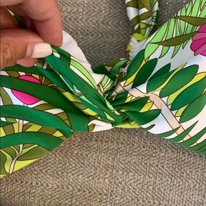 This is a top only, coordinating bottom sold separately. Color/pattern: multicolor. Design details: twisted front, gold-tone hardware, removable soft cups. Self-tie neck and S-hook back closures. Body: 83% nylon, 17% elastane. Lining: 84% nylon, 16% elastane. Hand wash.