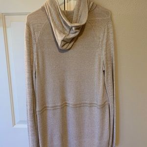 Like new Lululemon sweater. This has only been worn once or twice. See photos for details including thumb holes, hood and cinch-able waistline. Beautiful tan color goes with everything.