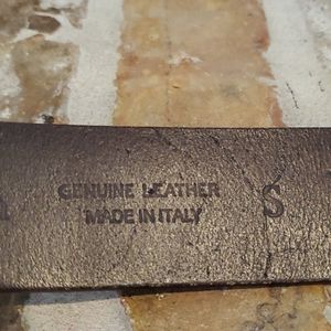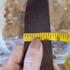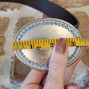 I am selling an awesome Abercrombie & Fitch Belt. This is a dark brown, genuine leather piece with a large, oval belt buckle. The buckle is adorned with blue, "glitzy," crystals and the letters A&F. The silvertone buckle is scratched however this is made on the vein of a western type belt so wear only adds character! Leather is sturdy and strong with minimal scratches, overall excellent condition. Belt measures 31.5" to 35.5" from smallest hole punch to largest.