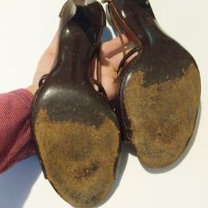 Philosophy di Alberta Ferretti leather open toe heels with adjustable silver side buckle. Made in Italy. 2.5" heel. Good condition with light wear on leather.