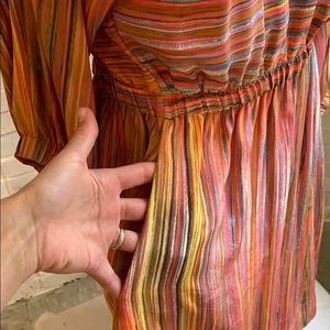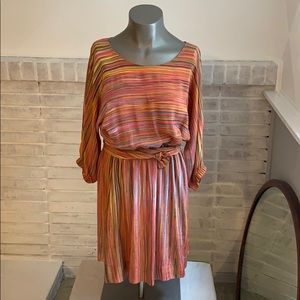 Ermie silk Watercolor painted striped dress. No size tag in this. But I would consider it closest to a size 6. About 36” long, and 13” across unstretched elastic waist. Side pockets and removable sash. Bought from a very small boutique in NYC, only worn a few times. Unique, one of a kind piece! Such vibrant colors!