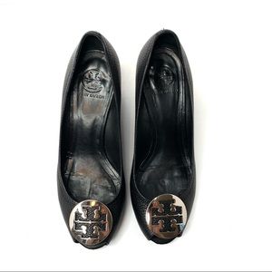 An elegant wedge-heel pump is cast in richly grained leather and topped with a gleaming Tory Burch logo medallion just above the peep toe.