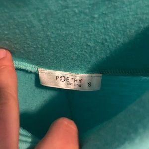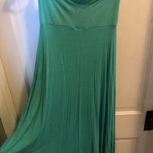 High-low skirt that hits roughly mid calf in the back and just above the knees in front. In great condition, only worn a few times. Robins egg blue in color, with a wide waist band that can be folded or left long. Jersey material, soft and breathable for summer or fall. Size small, fits a small or medium well.