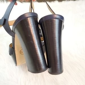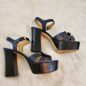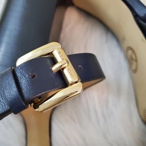Gorgeous Michael Kors Navy Blue Tara Platform Sandals in size 8.5. These have approx. 4.5 inch block heel with approx. 1.5 inch platform. Leather Flower details across the vamp and gold-tone hardware. Adjustable ankle strap with buckle closure. These are preowned in great condition. Very light scuff at the toe and some very minor scratches to heel and platform, All shone in pictures. See pictures for details.