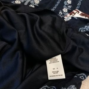 NWT, a very deep-almost black Navy blue, v-neck front + back with crew button detail as shown. The dress is Rayon + the full attached quality lining is polyester. Nicely detailed with two retro button closure on back of collar + well made. Flattering + versatile. It would be fine to fit a size range including medium + large.