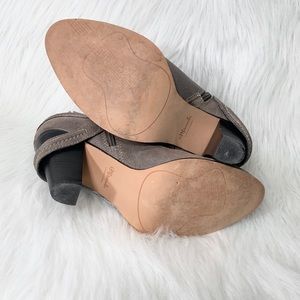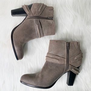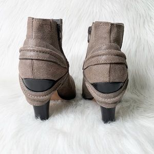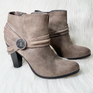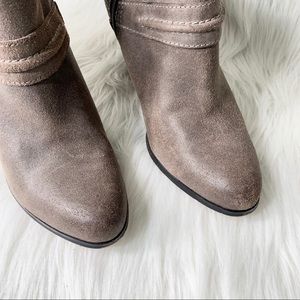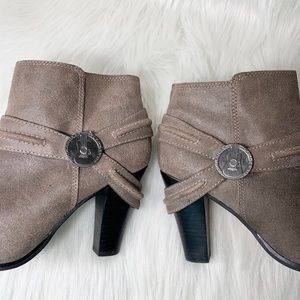 Miranda Lambert taupe leather heeled ankle boots. Decorative metal guitar medallions, strappy wrap arounds, higher heel, almond toe, tophits just above ankle. Textured slightly sueded leather. Inside zippers. Heel and shaft measurements in photos. Great condition, just light sign character wear, couple of scuff/scratches inside on leather liner-not visible outside (see pic of size for detail).