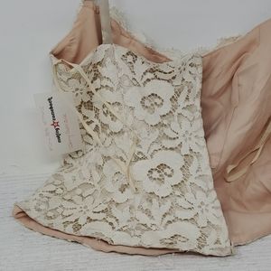 NWT. Never worn but may have a bit of storage wear. I'm going to say VG condition. See all pictures. Lined with satin straps and zip up back. From Vivian Dessy Diamond, Dessy Creations, NY and sold by Making a Comeback. Dry clean and made in USA. Not sure of size but measures the following laid flat: 17" pit to pit, front rise 13.5" and waist measures 17.75". Nice quality and details.