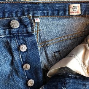 The best jeans anywhere!! Reselling unfortunately because I ordered from a seller and they’re a little snug. I do think these are on the smaller size so please keep that in mind. I want to help you order jeans that will fit you. Button fly and they are 99% cotton/1% stretch. Raw hem, skinny fit.