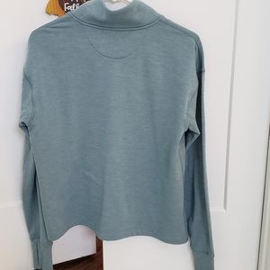 This pullover is so soft and comfy! Light, thin fleece yet still keeps you warm. Stretchy material. Fits TTS. I'm a true medium and it fits just right. Not oversized or baggy.