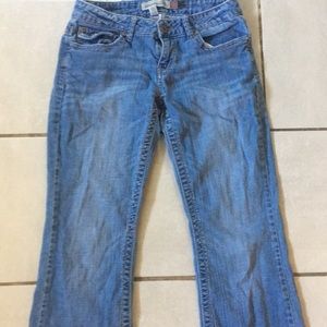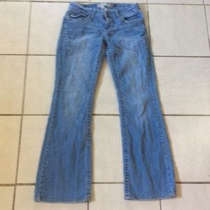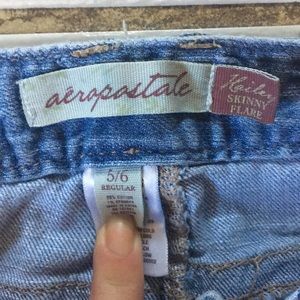UC SKINNY FLARE LIGHT BLUE JEANS THEY HAVE A FADED LOOK THE ONLY FLAW IS THEY WERE A LITTLE LONG SO THE BOTTOMS ONTHE BACK HAS SOME VERY SMALL WEAR AS SEEN IN PICS SIZE IS 5/6 BRAND IS AEROPOSTALE