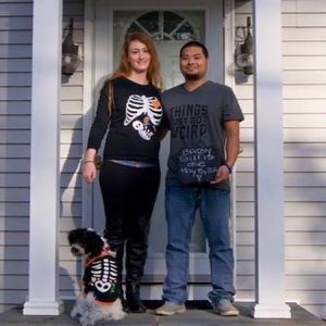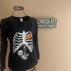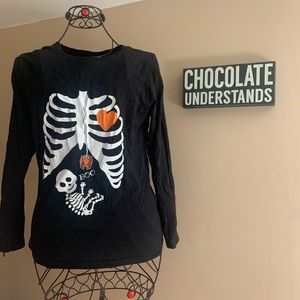 Cotton gildan size medium. Perfect way to announce your pregnancy in the fall! Complete with baby skeleton orange heart and spider. Worn once 🕷 ❤️ 🎃 maternity shirt but for very newly pregnant women as it’s not very stretchy! Cute pregnant skeleton