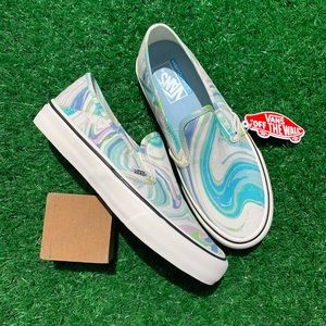 The Slip-On SF combines a deconstructed low profile silhouette with the Vans Surf SF build to create an upgraded, comfortable slip-on style with a collapsible heel. Made with water-based inks and glues, the Resin Swirl Slip-On SF also features sturdy canvas uppers with an allover print, molded UltraCush sockliners for upgraded cushioning, Vulc Lite construction, and classic rubber waffle outsoles with single-wrap foxing tape for lightweight comfort.