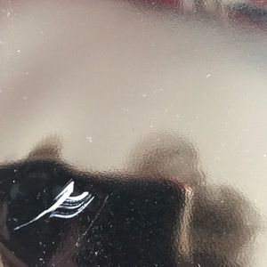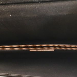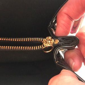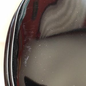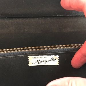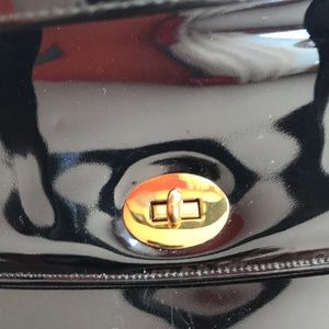 This is a larger Margolin bag, length 14 inches, height 9 inches, strap drop 6 1/2 inches. Shiny black synthetic, do not see any indication this is patent leather but may be. Brass color hardware, small area at closure that shows wear. Feet on bottom. Some white scratches on bag but they do not diminish beauty. Some scratches below front closure. Most unusual feature is the two brownish reddish balls at either end of bag top closure, believed to be plastic but perhaps Lucite. I have no idea.