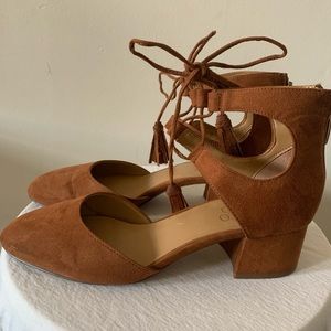 Franco Sarto low chunk heels that tie above the ankle in cognac color. Slight darker like on side of one shoe, as pictured. More suited for feet that are not wide.