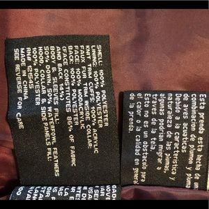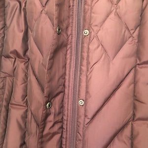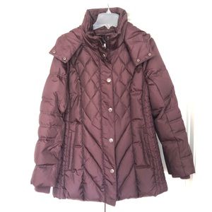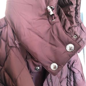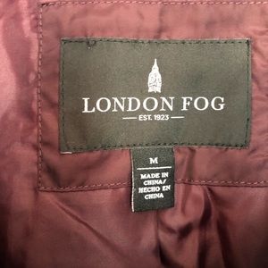 London Fog brand insulated puffy jacket. Detachable (zipper) drawstring hood with snap closures on front. Full length front zipper with snaps. Open front pockets. Knit cuffs at wrist for added protection against weather. Hits below the hips. Deep eggplant purple color. Size Medium. Excellent condition, only worn twice. Provides great protection against wind/rain.