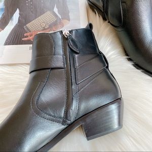 A wraparound belt with gleaming ring buckles cinches the shaft of a pointy-toe bootie set on a slanted block heel.