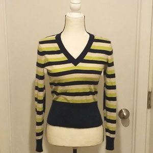 V neck pullover with elbow patches that are not only cute but functional by creating an extra layer of protection. The colors are a vibrant green offset by navy blue and cream. Quality thick cashmere.