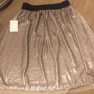This beautiful Flashing Lights FP midi skirt features fun all-over sequins in a pretty champagne/pale gold color. Black stretchy waistband. Draped A-line shape. Approx mid-knee length. Mesh detail at hem gives a layered look. Size Small