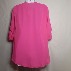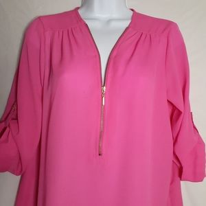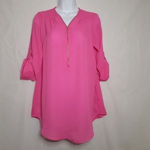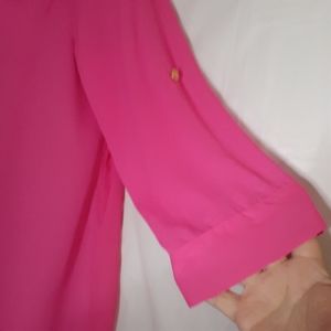 Bright pink, gold tone zipper v-neck line and buttons on 3/4 sleeves .roll up sleeves with a extra button. Cheerful and flowy blouse