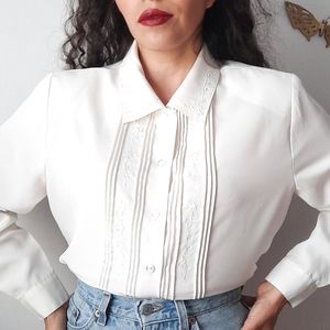 In excellent vintage condition. In a cream π¦ off white color. 100% polyester with no stretch. Embroidered collar will pleats down the center front. Please look at all the pictures to ensure best fit. By the brand Laura Scott