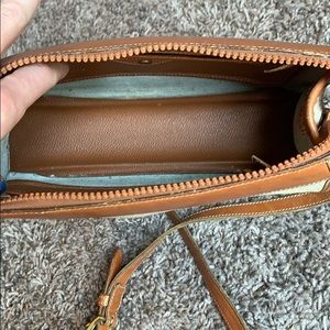 Vintage Dooney & Bourke all weather leather crossbody purse. Cream color with brown trim. Has signs of wear, see photos. Interior has two inner zip and button snap pockets. The interior bottom lining piece shows the sides lifting. Doesn’t affect use. Measures approx 11” across and 7” tall.