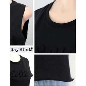 Black “INSPIRE” Embossed Logo Crop Tank. 3D block letters graphic a soft and breezy jersey tank designed to keep you cool with its cropped, boxy silhouette. Features round neckline, raw edge cutout sleeves and hemline. Sleeveless Relaxed boxy fit. Super cute pair with high waist active leggings, distressed jeans or joggers! Options are endless! Active Lounge Casual Motivation Chic