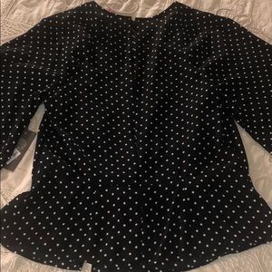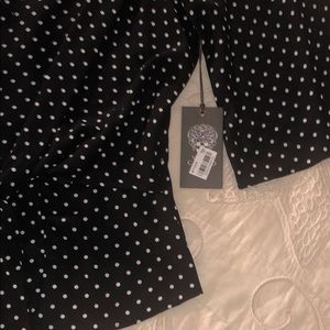 Tied up at the front in a glamorous knot, this Vince Camuto black top with white dots is any ensemble's focal point. Its drapey fit and wide sleeves make a subdued statement.