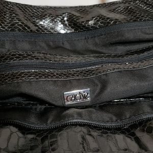 Never used Cache faux leather bag. 4 corners zip open to show accent white color. Has adjustable/ removable shoulder strap. Approximately 12" x 12" x 12". One small scratch, see image. From non smoking home