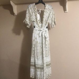 The folksy fabrics in LoveShackFancy's Resort '20 collection are inspired by vintage tablecloths. Designed with a plunging front that mirrors the V-back, this 'Augusta' midi dress is cut from broderie anglaise and detailed with gold threads to highlight the pretty floral pattern. The plush velvet bow and scalloped edges enhance the romantic, bohemian vibe. Brand new with tags