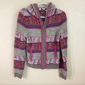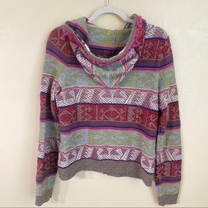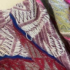 Artisan like craftsmanship in this beautiful wool blend colorful sweater from Moth by Anthropologie. Vibrant patterns & colors with small pink fringe like piping.