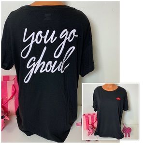 YOU GO GHOUL PRINT IN THE BACK, EMBROIDERED VAMPIRE LIPS IN THE FRONT, SHORT SLEEVE SHIRT.