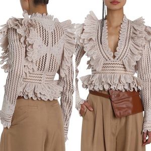 Zimmermann Unbridled Battenberg Bodice featuring a deep V-neckline, scalloped textural trimming, full length sleeves, peplum hemline, concealed zipper back, and super pretty appliqué detailing. This is an absolutely stunning top, but it was an impulsive purchase and I only wore it twice. Will ship with the tag and a Zimmermann dust bag if buyer wants it! As styled on Sofia Richie — I also have the shorts and bag she paired this top with and I’m willing to sell!