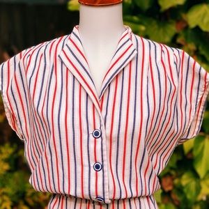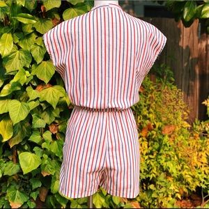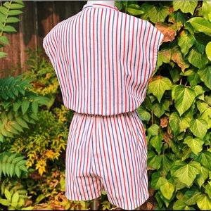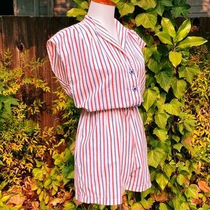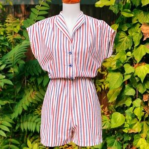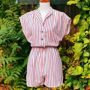 Sweet little red, white & blue cotton cap sleeve romper circa 1980's. Featuring lightweight (but not sheer) textured cotton fabric in a cute nautical striped pattern, button front closures from chest to waist, and elastic waist. In excellent vintage condition with no noted flaws or defects. Best fits a S-M. See measurements for exact fit.