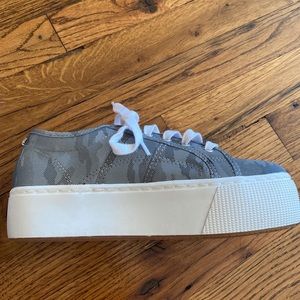 Steve Madden grey camo sneakers never worn. Outside fabric is satin vinyl size 6
