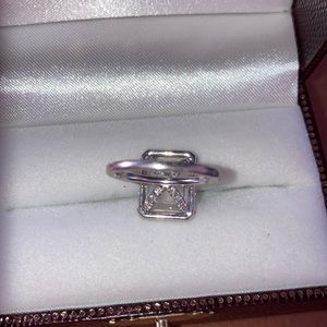 Custom made 14 carat white gold diamond ring. One Center emerald cut white cubic zirconia complemented by 54 round brilliant cut genuine diamond swing approximately .78 carats, F color, VS one clarity. Size 4.5. Appraisal included from prominent Newport jeweler Grenon‘s of Newport.