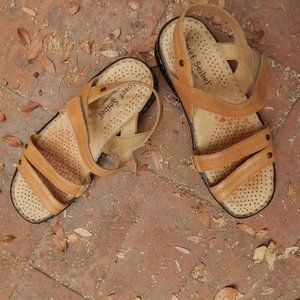 Tan sandal. Walk everywhere in this strappy sandal with a cushioned footbed and superb arch support, You will not be sorry you purchased this sandal. Great for travel and walking places