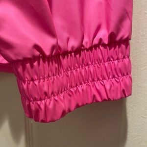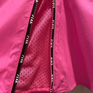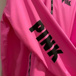 NWT - Victoria Secret PINK Hooded Anorak. Has zipper at neck and both right + left hips. PINK on both arms and left chest. Black zippers are embellished with the PINK logo. Lightweight jacket for rainy days or can be worn for workouts outside. 💕