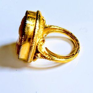 One of the most popular cameos, the pony tail girl from the 1960's. A larger sized cameo looks great with the 24" inch chain. Has a very tasteful satin finish in Gold tone. It will make quite a fashion statement whenever you wear it! Also the beautiful and highly collectible vintage Cameo gold matching ring comes w/ the locket. It is adjustable size. Real Cameo hand carved out of shell, See Last Pic!! The shell on both fades from peach to a coral color. EVC!
