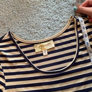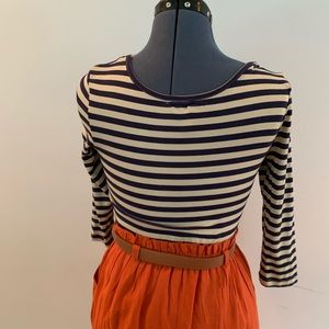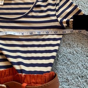 This french inspired dress will have u ready 2 be queen of the pumpkins~ bodycon navy and white striped top with pumpkin paper bag skirt with pockets. Comes with belt! From my personal closet, only worn once or twice. Size s but very stretchy and fits s/m.