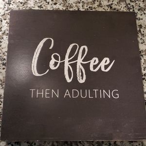 Hobby Lobby 12x12 wooden Coffee then Adulting Sign. Black with white type.