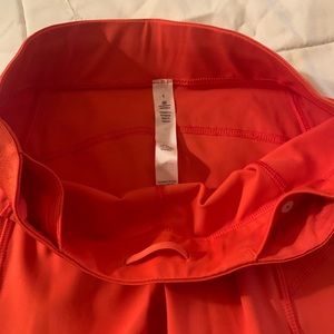 Orange Lululemon What The Sport Short. Brand new with tags. Two pockets on the side. And two small pockets inside on the waistband, on either side of the drawstring. Size 4.