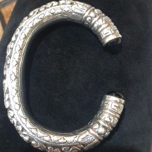 Sterling silver bracelet with intricate scroll design and black onyx at ends of opening. Made in India. Solid weighted piece that wraps around wrist and sits nicely. Fantastic condition.
