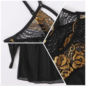 New Sexy Sheer Black & Gold Lace Babydoll Slips